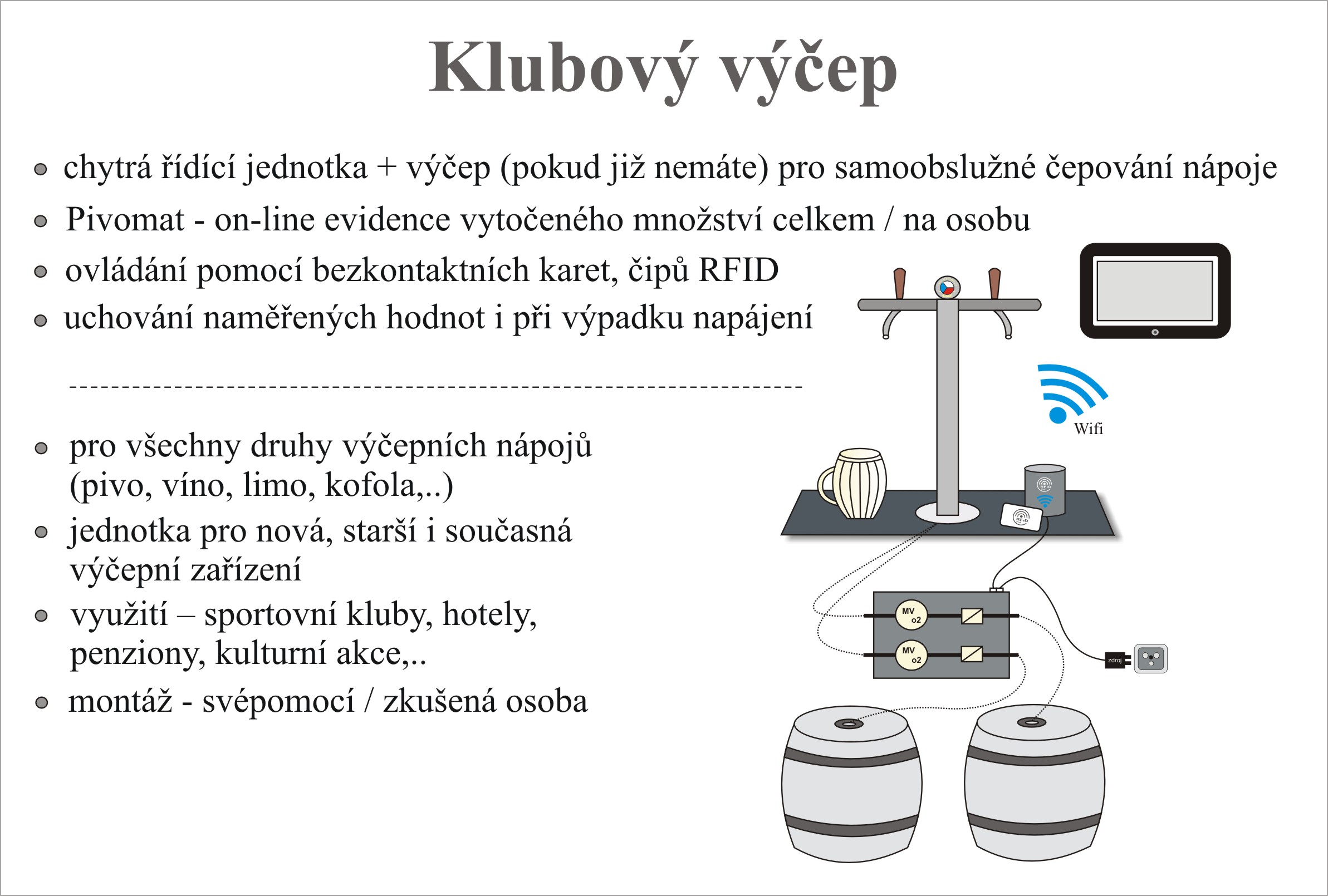 Tento produkt obsahuje řídící jednotu, která umožní samoobsluhu výčepního zařízení. Tato elektronika se hodí pro nové i současné výčepy, ať už do sportovních klubů, restaurací, hotelů, apod. Je nastavitelná pro každý druh nápoje ( pivo, limo, víno, kofola, …).