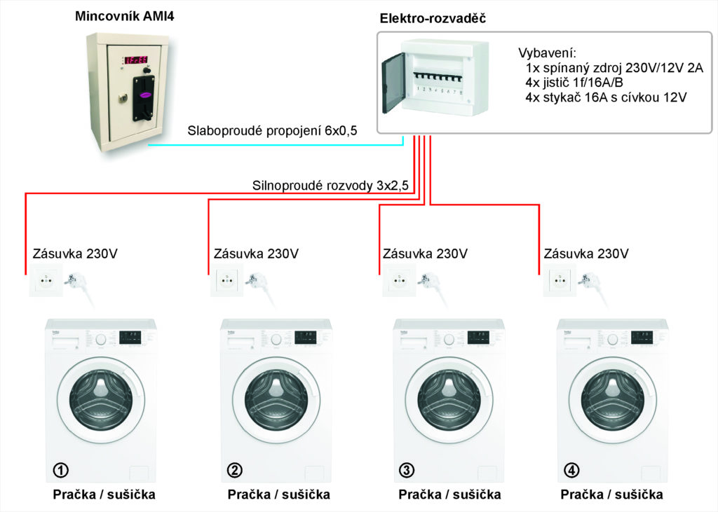 Zapojení se provádí ve stávajícím nebo novém rozvaděči, který se rozšíří o čtyři spínaná relé a jeden zdroj 12 V. Mincovník a elektrorozvaděč jsou propojeny slaboproudým kabelem, který zajišťuje bezpečný přenos řídicích signálů bez nutnosti práce se síťovým napětím. Celý systém tak zůstává elektricky oddělený a bezpečný pro obsluhu i uživatele.
