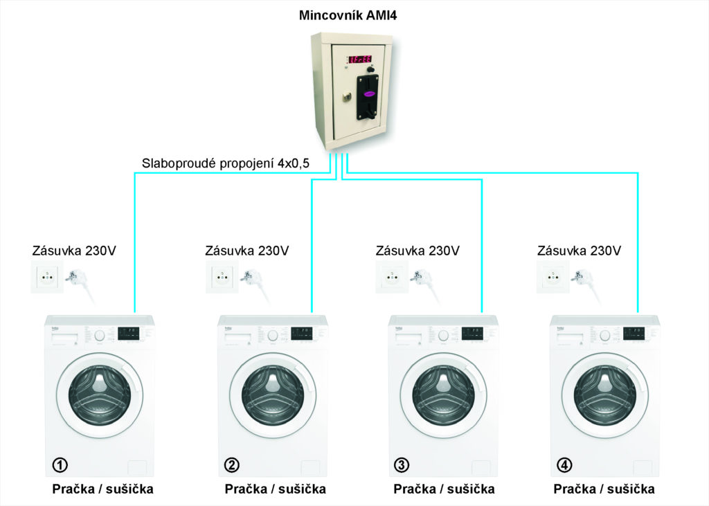 Druhá možnost je úprava samotného zařízení, tedy pračky nebo sušičky, pro připojení tzv. mincovního kontaktu.